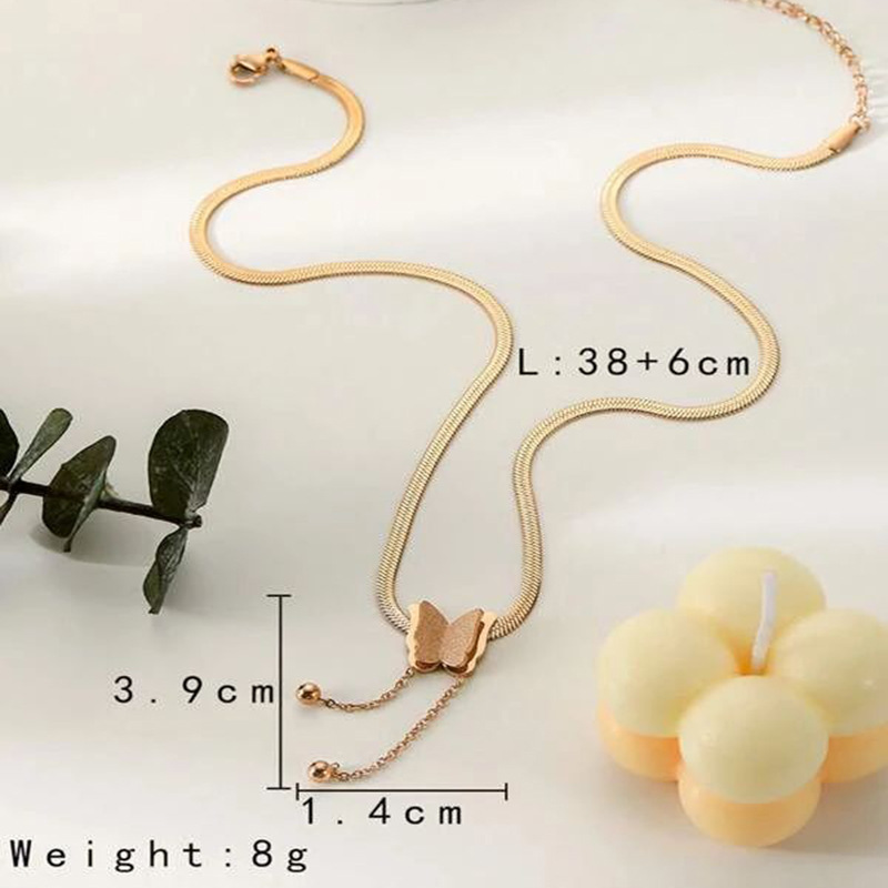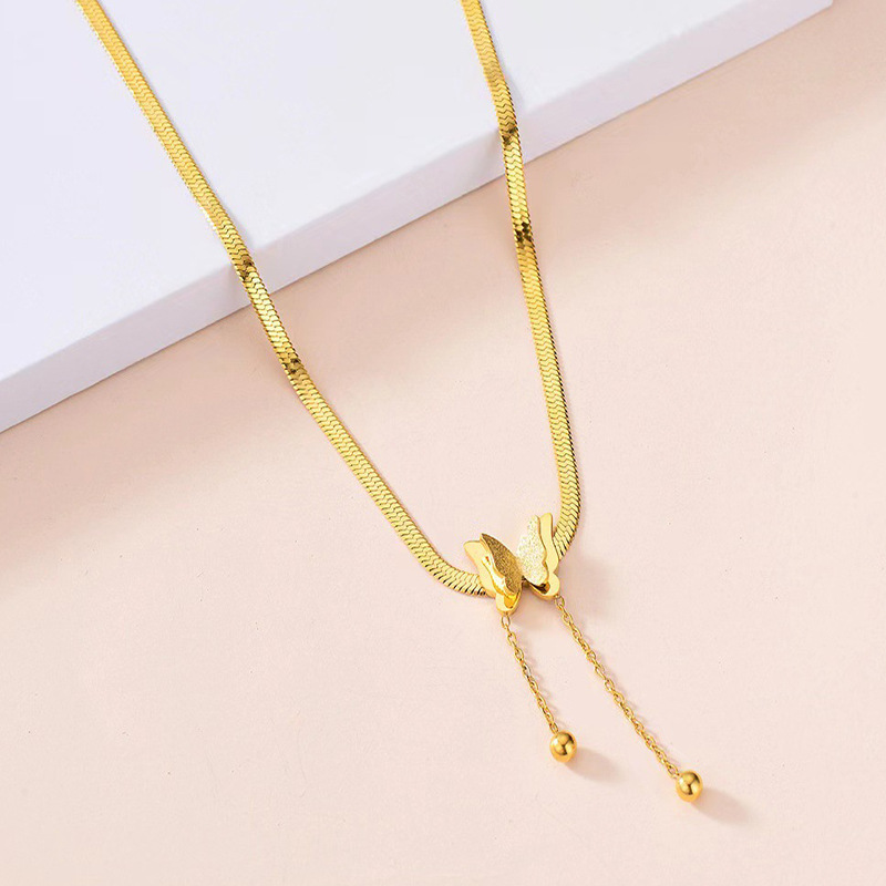 This elegant necklace features a smooth snake chain design with a delicate butterfly centerpiece and tassel drops, creating a stylish and modern jewelry piece. The refined gold finish and graceful silhouette make it ideal for everyday fashion, special occasions, and layering with other accessories.
